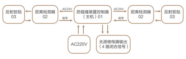 防碰撞裝置系列產(chǎn)品由防碰撞控制器(主機)距離檢測器,鉆石級反射板或反射膠貼等附件組成。