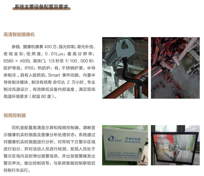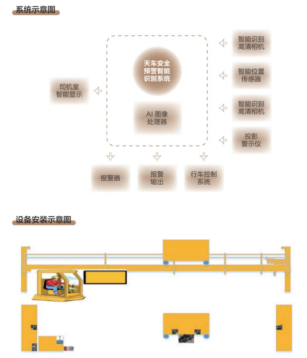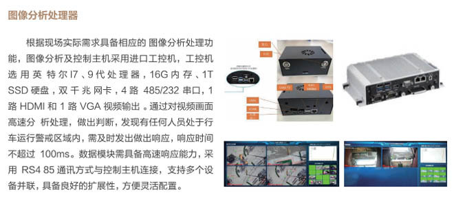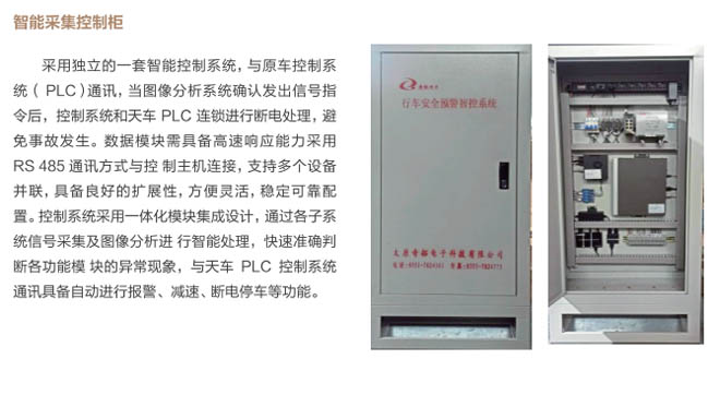 6、行車智控系統(tǒng):控制系統(tǒng)采用一體化模塊集成設(shè)計(jì), 通過(guò)各子系統(tǒng)信號(hào)采集及圖像分析進(jìn) 行智能處理,快速準(zhǔn)確判斷各功能模 塊的異,F(xiàn)象,與主機(jī)PLC控制系統(tǒng) 通訊連接具備自動(dòng)進(jìn)行報(bào)警、減速、斷電停車等功能,當(dāng)系統(tǒng)確認(rèn)發(fā)出信號(hào)指令后,控制系統(tǒng)和行車PLC連鎖進(jìn)行斷電處理,避免事故發(fā)生。