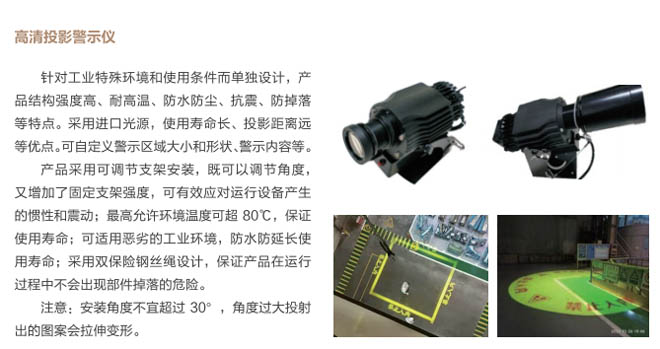 1、區(qū)域警示系統(tǒng):在行車小車底部增加一臺(tái)工業(yè)警示儀,投影到行車吊鉤下方6米范圍內(nèi)作為警戒區(qū)、4米范圍內(nèi)作為危險(xiǎn)區(qū)(警示區(qū)域可自行設(shè)定區(qū)域范圍大小及圖像形狀和文字內(nèi)容)