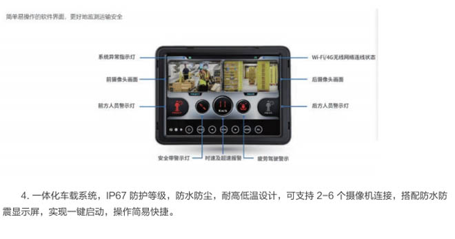 4.智能集成化設(shè)計,一鍵開啟車載系統(tǒng),AI精準識別、人車防撞、車車防撞、盲區(qū)防撞等。