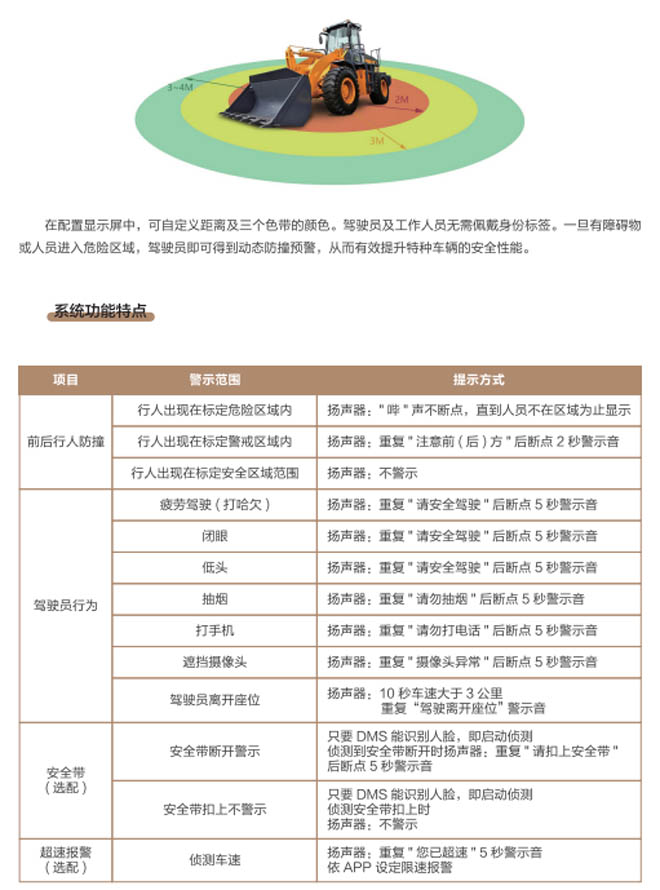 特種車輛智能識別防撞預(yù)警系統(tǒng)是專為工程車輛叉車、裝載機、挖掘機、推土機、礦山港口移動車輛設(shè)備所設(shè)計的智能識別防撞預(yù)警安全裝置,能夠?qū)崟r偵測工作區(qū)域的危險狀態(tài)并提供警示,有助于提升預(yù)防工程特種車輛作業(yè)安全。一旦有障礙物或人員進入危險區(qū)域,駕駛員可得到動態(tài)防撞預(yù)警并發(fā)出報警進行實時減速或停車,該系統(tǒng)能在各種復雜廠區(qū)路況及工礦環(huán)境中幫助駕駛員避免危險,預(yù)防事故發(fā)生減輕壓力,提供豐富的駕駛員輔助環(huán)境感知等功能